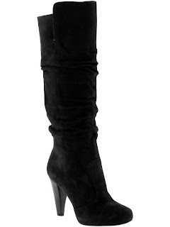Here is a Via Spiga, the Parley slouch boot with a similar look but in black suede with a moderate 3 1/2 ” heel and hidden platform.  The scrunched leather is wider than the average boot and leaves more room to breathe from morning to night on these long winter days.  I found these at Piperlime.com. Oh and I must add as I have before, they have FREE SHIPPING! Love that.