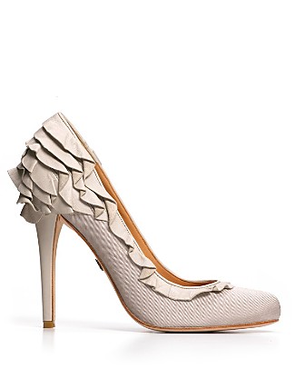 Ruffle pumps, such as this Badgley Mischka heel above are a truly lovely style seen a lot this winter. Whether placed on the toe, such as the deep eggplant BCBGMaxAzria Lark I featured last week, or along the heel on these gorgeous Badgley Mischkas, the ruffle adds a feminine and pretty feel to a smooth, classic heel. With a fine leather sole and upper and fabric detail, at 4 1/4 inches, the Tai is not only pretty but SEXY for sure!! Perfect for that anticipated date whether already planned or to just simply be ready as who knows what tomorrow will bring. My thought is that this heel will be stylish for years to come and will hold memories.