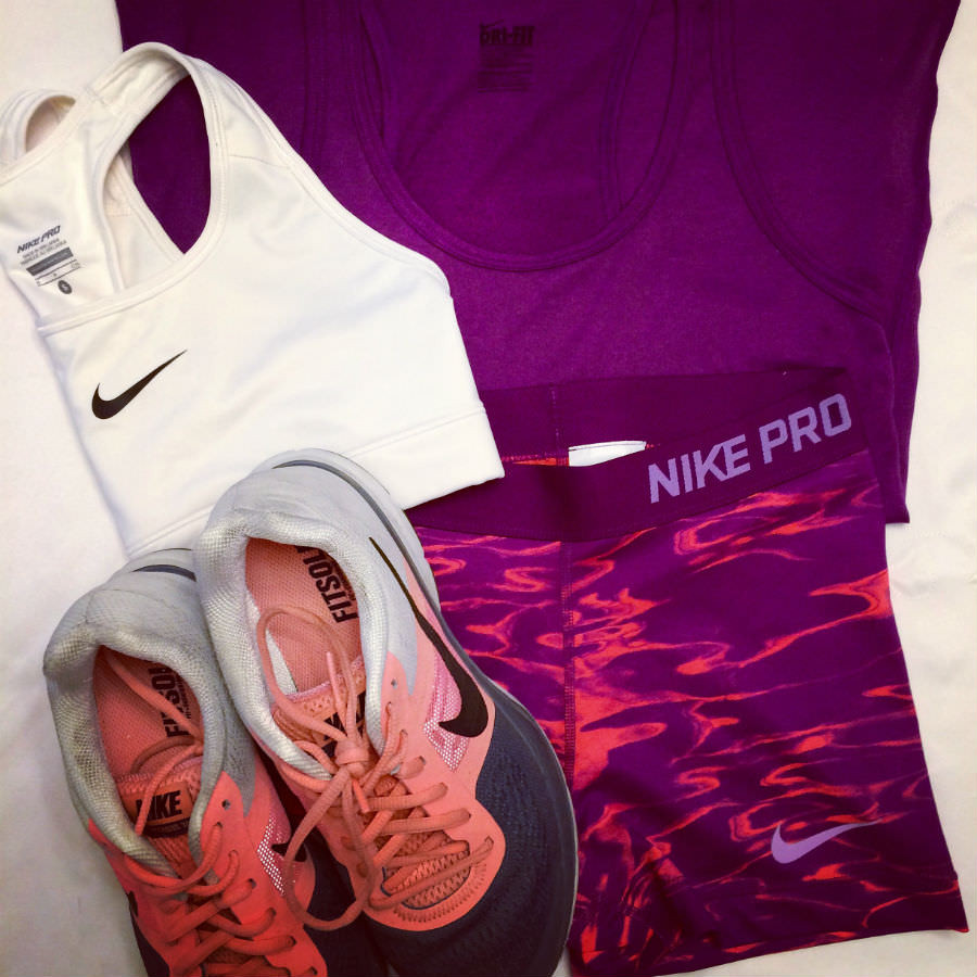 Clockwise from top: Nike Pro Bra; Dri Fit Tank; Nike Pegasus Shoes; Nike Pro 3″ Shorts